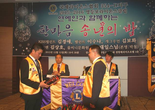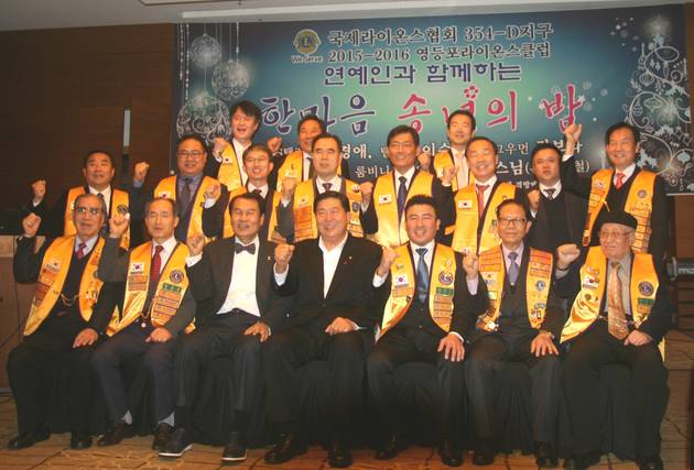 [영등포방송] 영등포라이온스클럽(회장 김호상)은 12월 15일 타임스퀘어 메리어츠호텔 4층 연회장에서 조길형 구청장과 김영주 국회의원, 박선규 새누리당 영등포 갑 당협위원장, 서울시의회 최웅식(운영위원장), 김정태 의원, 영등포구의회 윤준용(부의장), 정선희(운영위원장), 고기판(예결위원장), 이용주, 김길자, 강복희, 김재진 의원, 유태전 전 라이온스클럽 354D지구 총재, 김중섭 영등포경찰서 생활안전연합회장, 정륜규 영등포라이온스클럽 직전 회장 등 내빈 및 회원들이 참석한 가운데 2015년 한 해를 마무리하는 ‘송년의 밤’ 행사를 개최 했다.