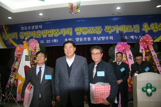 [영등포신문=김경진 기자] 중앙지구대 중앙자율방범봉사회(회장 박균영)는 한 해 동안 주민의 안전과 지역 범죄예방을 위해 노력한 대원들의 노고를 격려하고 지역의 소외계층 어르신들을 위해 지난 22일 베누스웨딩홀에서 ‘영등포동 독거어르신 후원의 밤‘ 행사를 개최했다.