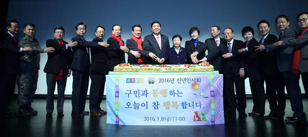 [영등포신문=이승일 기자] 영등포구는 8일 오전 영등포아트홀에서 지역주민 2천여명과 함께 새해맞이 인사와 덕담을 나누는 신년인사회를 개최했다. 조길형 구청장(가운데)이 지역 내 주요인사들과 함께 새해를 기념하는 의미를 담아 떡을 자르고 있다.