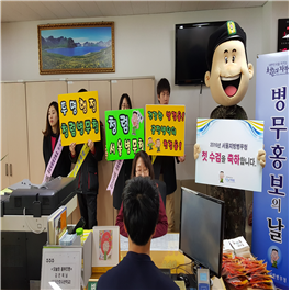 한편 서울병무청은 이날 수검자 전원에게 소정의 기념품과 현역모집병에 관한 맞춤형 정보를 제공하고, 이상진 청장은 이날 “공정하고 투명한 병역처분으로 병역이 자랑스러운 문화창조를 위해 일로매진하여 국민이 행복한 정부3.0 구현에 최선을 다하겠다”고 밝혔다.