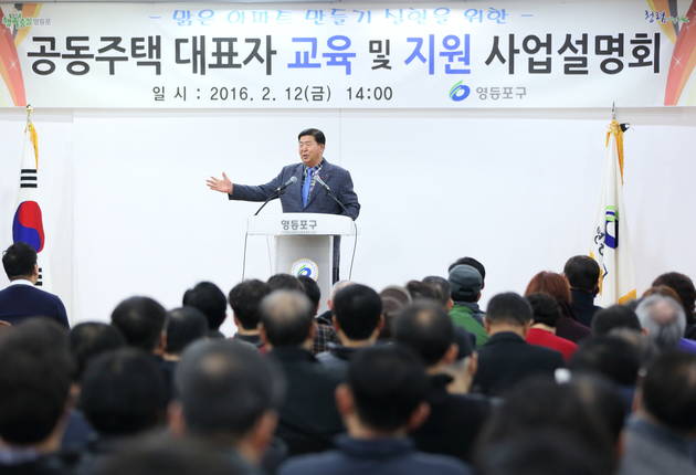 [영등포신문=이승일 기자] 조길형 구청장(왼쪽)이 12일 오후 2시 영등포아트홀 2층에서 열린 공동주택 대표자 교육 및 지원 사업설명회에서 아파트 입주자대표회장과 관리사무소장 등 500여명을 대상으로 공동체 활성화와 안전한 주거환경 조성에 대한 내용을 당부하고 있다.