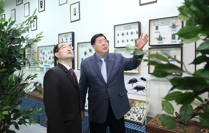 [영등포신문=김경진 기자] 조길형 구청장(오른쪽)이 17일 오후 곤충체험학습장에서 안종인 남부교육지원청 교육장(왼쪽)에게 전시된 곤충을 설명하고 있다. 영등포구는 8백여종 6천마리의 곤충 표본과 화석 등을 볼 수 있는 이 곳 곤충체험학습장을 통해 어린이들에게 생생한 자연생태 교육을 제공해오고 있다.