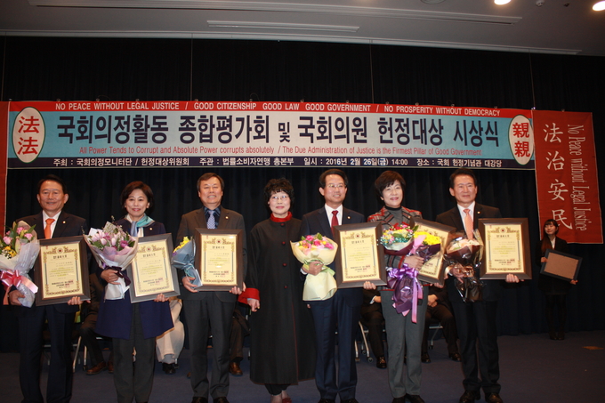 이번 종합헌정대상은 국회의원들의 의정활동을 오랫동안 모니터링해온 법률소비자연맹이 지난 4년간의 의정활동을 본회의 출석률, 입법성적, 국정감사 성적, 상임위원회 활동 등 13개 항목을 분석해 국회의원의 의정활동을 종합적으로 평가한 결과다.