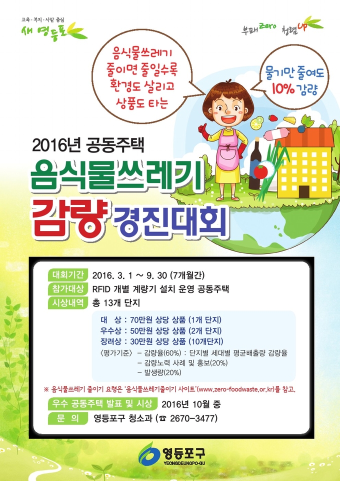 [영등포신문=이승일 기자] 영등포구가 음식물쓰레기 감량을 위한 주민들의 자발적 참여를 독려해 쓰레기 발생량을 원천적으로 줄이고자 ‘공동주택 음식물쓰레기 감량경진대회’를 개최한다고 밝혔다.