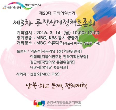 [영등포신문=이승일 기자] 중앙선거방송토론위원회는 제20대 국회의원선거와 관련해 오는 3월 14일 오전 10시부터 12시까지 MBC 스튜디오에서 제3차 공직선거정책토론회를 개최한다고 밝혔다.