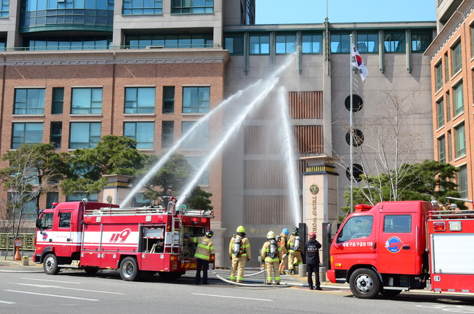 [영등포신문=육재윤 기자] 영등포소방서는 24일 오후 여의도동 소재 트럼프월드2차 아파트건물에서 소방차 8대가 동원되어 실전대응 능력향상을 위한 화재진압 및 인명구조・대피 등 자위소방대의 방화환경 조성과 초동조치 능력을 배양하기 위한 합동소방훈련을 실시했다.