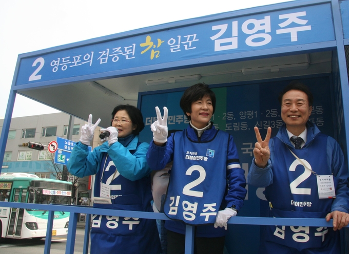 [영등포신문=이승일 기자] 선거운동 첫날인 31일 오전 영등포구청앞에서 더불어민주당 영등포갑 김영주 후보가 유세차에 올라 김정태 서울시의원, 박정신 구의원과 함께 선거운동을 펼치고 있다.