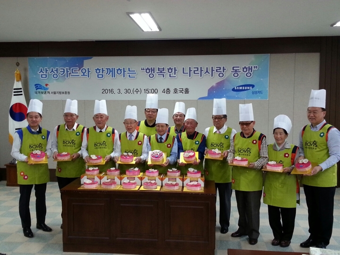 특히 이번 ‘행복한 나라사랑 동행’은 단순히 국가유공자를 위문하고 봉사하는 것에서 탈피하여 국가유공자 어르신들이 직접 나눔 봉사활동에 참여해 그 의미가 남달랐으며 삼성카드 임직원 및 보훈공무원 등 30명도 함께 했다. 이 날 재능기부 봉사활동으로 만들어진 떡케익은 감사의 마음을 담아 서울지역 거주 독거 국가유공자분들께 전달됐다.