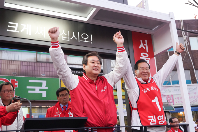 [영등포신문=이승일 기자] 공식 선거운동 첫날인 31일 저녁 새누리당 김무성 당대표가 권영세 후보 지원 유세를 위해 영등포지역을 방문해 대림동 우리시장 앞에서 권영세 후보와 손을 잡고 지지를 호소하고 있다.
