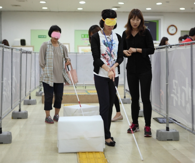 우선 시각장애 체험은 안대를 착용하고 점자블록 따라 걷기, 그림 그리기, 음료 알아맞히기 등 다양한 체험을 실시한다.