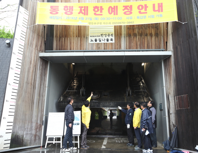 [영등포신문=김경진 기자] 영등포구는 21일 오전 한강공원 주변에 설치된 육갑문 4개를 시험 가동했다. 육갑문이란 한강 수위 상승시 역류로 인한 침수피해를 방지하는 수방시설로, 이 날 구는 태풍이나 장마 등 비상 상황시에 육갑문이 제대로 작동할 수 있도록 권양기 관리, 수밀상태, 토사 적치 여부, 수위표 정비상태 등을 점검했다.
