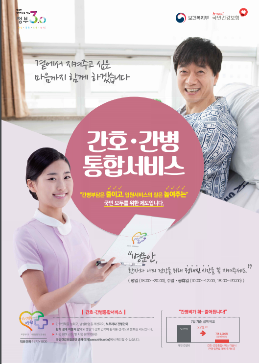 지난 해 말까지 포괄간호서비스로 불린 간호․간병통합서비스 사업은 전문 간호사가 환자의 간호 뿐만이 아니라 간병까지 책임지는 서비스이며 건강보험의 적용을 받아 종합병원 6인실 기준 입원료 본인부담은 1일 18,130원~22,150원에 불과하다.
