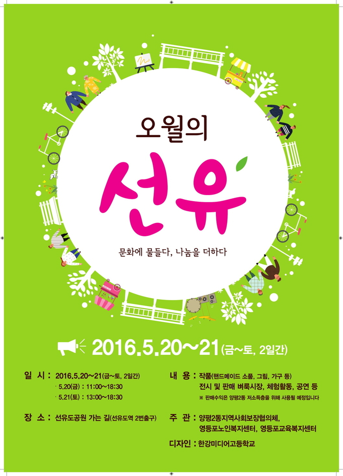 ‘오월의 선유’는 관내 주민과 지역예술인 등이 함께 하는 마을 나눔 행사다. 선유도공원 가는 길, 재능 있는 주민들의 작품을 소개하고, 지역예술인의 작품도 전시 및 판매한다. 지역단체 등의 바자회 행사도 열리며 관내 학교와 복지기관 등도 참여해 자리를 빛낸다.