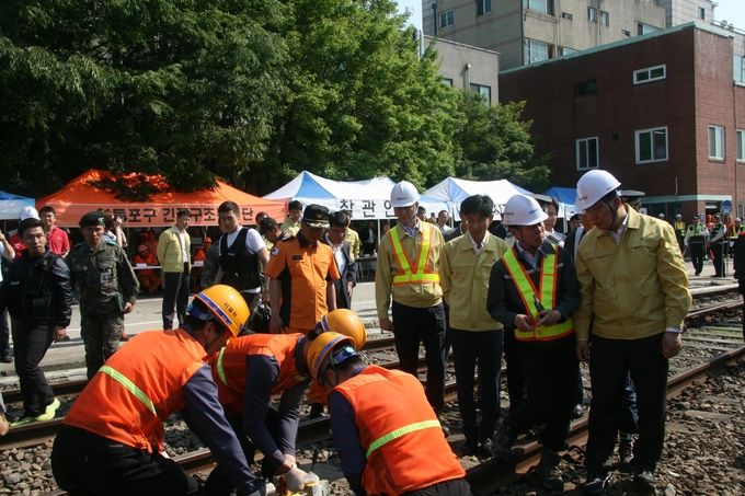 이날 홍순만 코레일 사장을 비롯해 52사단장, 신윤균 영등포경찰서장, 이귀홍 영등포소방서장, 영등포구청 관계자 등 경찰, 소방, 군 병력 등 관계기관 직원 3백여 명이 참여해 재난 상황에서의 협업 체계를 점검했다.