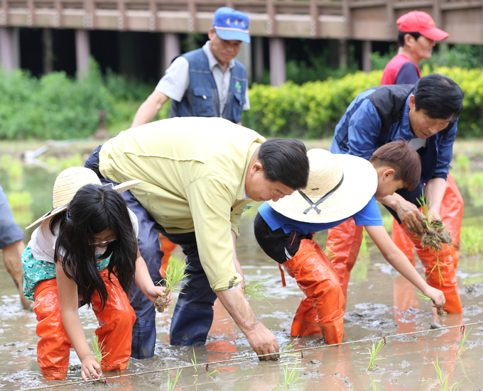 [영등포신문=김경진 기자] 조길형 구청장(가운데)이 24일 오후 양평유수지 생태공원 내 조성된 논에서 어린이들과 함께 모를 심고 있다. 이 날 구는 어린이, 지역주민을 대상으로 모내기 체험행사를 마련해 1,188㎡의 논에 모를 심었다.
