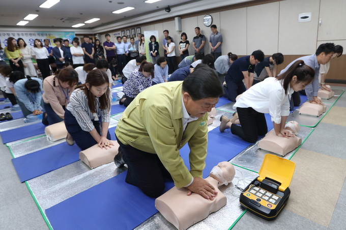 [영등포신문=김경진 기자] 조길형 구청장(가운데)이 27일 오후 구청 3층 기획상황실에서 직원들과 함께 심폐소생술을 실습하고 있다.