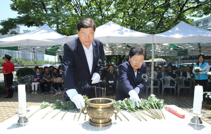 [영등포신문=김경진 기자] 조길형 구청장(왼쪽)이 6월 호국 보훈의 달을 맞이해 2일 오전 신길동에서 열린 반공 순국용사 위령제에 참석해 박정자 구의회 의장과 함께 헌화하고 있다.