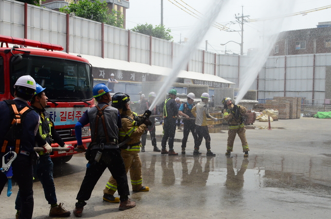 이날 훈련은 재난상황발생 시 초기대응의 중요성과 특수소방차량을 최대한 활용 및 비상용승강기 위치 파악, 공사장 내 화재취약장소 확인, 재난발생시 건물 내 인명대피 및 인명구조 훈련, 자위소방대의 소화기 및 소화설비를 이용한 화재진압훈련 등에 대한 합동 소방훈련을 실시했다.