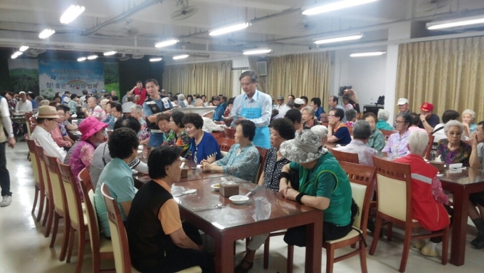 특히 이 지역 출신 유광상 서울시의원과 김찬숙 자원봉사센터장은 어르신들에게 손수 삼계탕을 대접해드리며, 어르신들과 덕담을 나누기도 했다. /김경진 객원기자