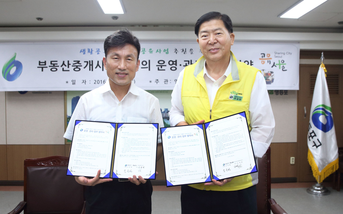 [영등포신문=김경진 기자] 조길형 구청장(오른쪽)이 8일 오전 구청 3층에서 지역 내 부동산중개사무소 18개소 대표 김명환씨와 생활공구 나눔 등 공유사업 추진을 위한 업무협약을 체결했다.