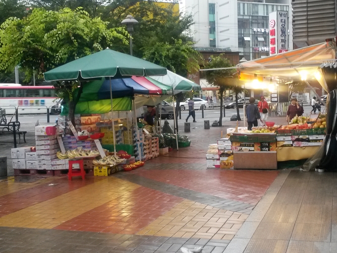 영등포구 당산역 2·9호선 환승역인 9호선 1번 출구. 하지만 이곳에서 매일 과일과 각종 야채를 가게 맞은편에 가판을 벌여 놓고 장사를 해도 단속하는 사람은 아무도 없다.