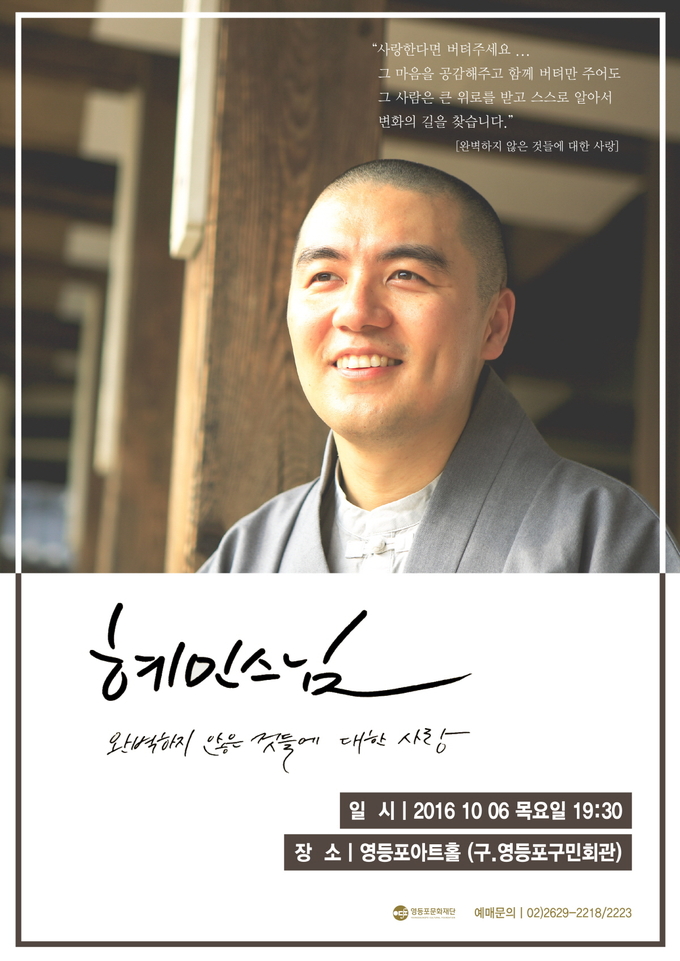 영등포문화재단은 제21회 영등포 구민의 날을 기념하여 혜민스님과 함께하는 마음치유콘서트 ‘완벽하지 않은 것들에 대한 사랑’을 오는 10월 6일 오후 7시 30분 영등포아트홀에서 개최한다.