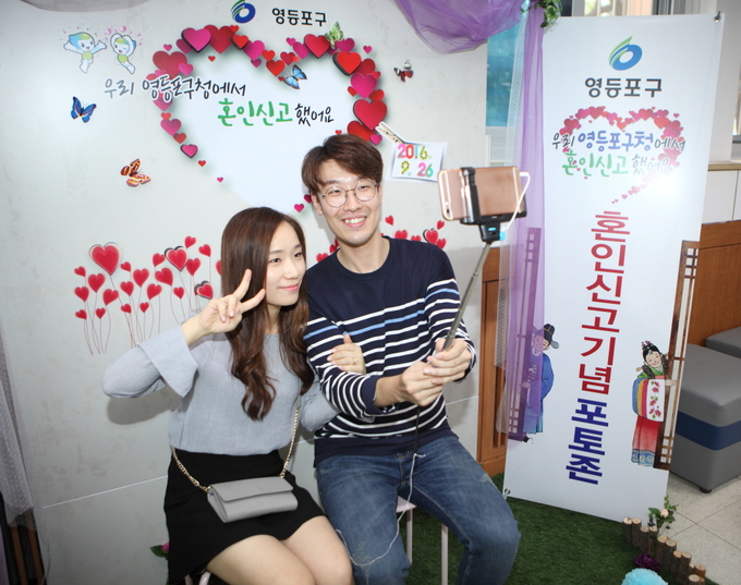 [영등포신문=김정남 기자] 영등포구청 1층에서 혼인신고를 마친 예비부부가 인증 사진을 찍으며 의미있는 날을 기념하고 있다. 영등포구는 구청 1층 민원여권과 일반민원실에 혼인신고 기념촬영을 할 수 있는 ‘혼인신고 기념 포토존’을 마련했다.