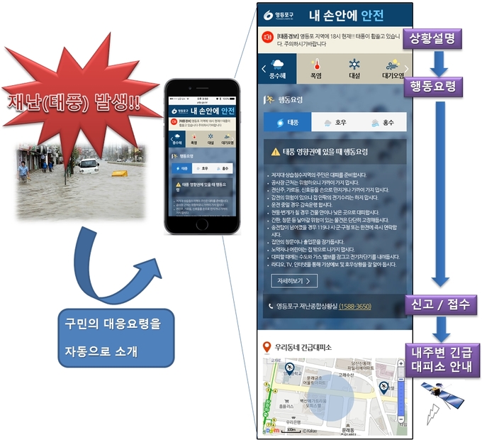 이를 해결하기 위해 구는 지역 주민이 재난을 당했을 때 무엇이 필요하고, 무엇을 해야 하는 지 시나리오를 기반으로 가장 빠르고 신속하게 알려주는 ‘내 손안에 안전 서비스’를 시행한다고 밝혔다.