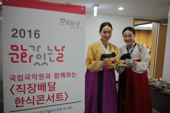 매월 마지막 주 수요일 ‘문화가 있는 날’에 전국을 순회하면서 열리는 ‘직장배달 한식콘서트’는 어려운 경제 여건 탓에 힘들어하는 직장인․근로자들을 찾아가 국악 감상과 한식 체험을 통해 마인드 힐링과 사기 진작, 그리고 더욱 행복한 직장을 만드는 마중물 역할을 하고 있다.