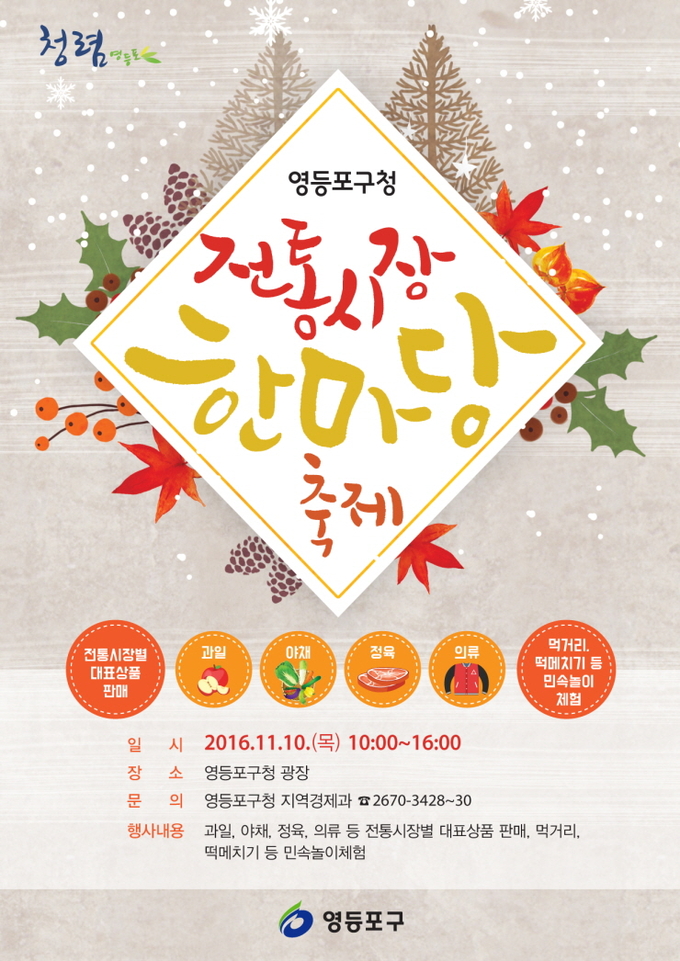 [영등포신문=김경진 기자] 영등포구는 10일 구청광장에서 지역 내 전통시장의 우수상품을 한 자리에서 만나볼 수 있는 ‘전통시장 한마당 축제’를 연다고 밝혔다.