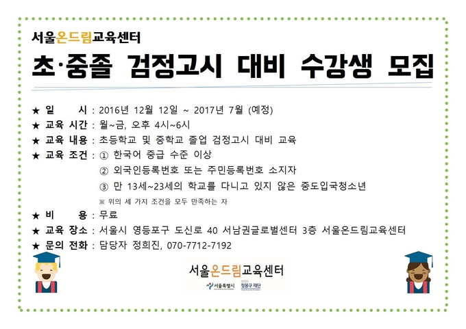 [영등포신문=김정남 기자] 서울온드림교육센터(센터장 김수영)에서 초·중졸 검정고시 대비 교육생을 모집한다.