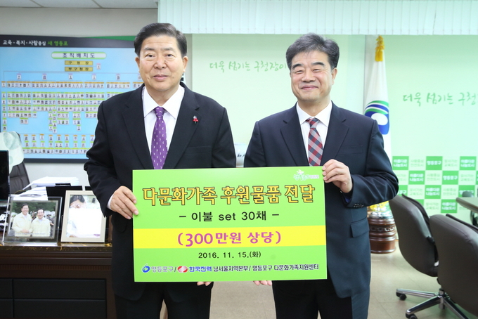 [영등포신문=김경진 기자] 조길형 구청장(왼쪽)이 15일 영등포구청 3층 구청장실에서 한국전력 남서울지역본부(본부장 김재승)로부터 300만원 상당의 이불세트를 후원받았다. 이 후원품은 저소득다문화가족 30가구에 전달한다.