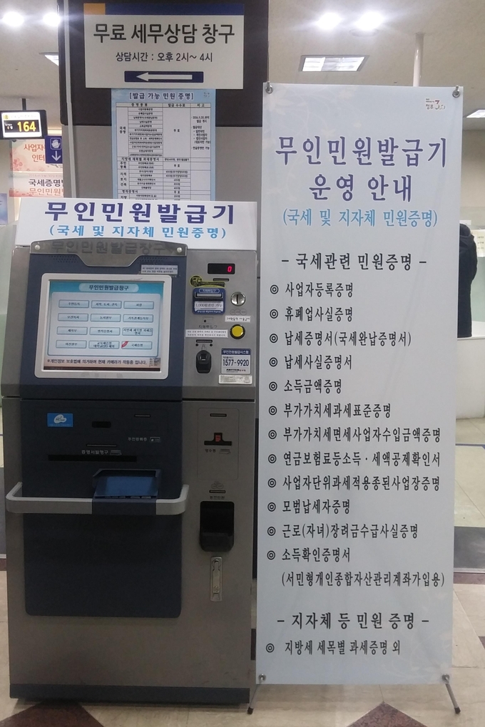 국세청은 이미 9월 30일부터 전국 지방자치단체에서 운영하는 3천 3백여대의 무인민원발급기를 통해 민원증명 발급서비스를 개시하고 있어 민원인이 편리하게 이용하고 있는 중이다.