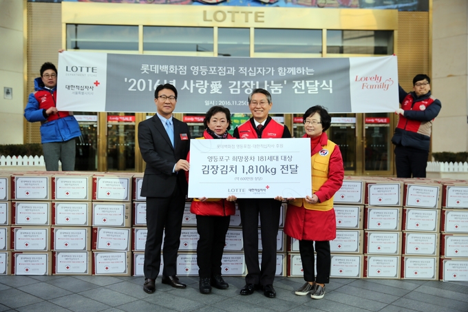 롯데백화점 영등포점은 영등포구 관내의 독거노인, 정부지원을 받지 못하는 차상위계층 등 복지사각지대에 놓인 지역 취약계층이 따뜻한 겨울을 보낼 수 있도록 대한적십자사 구로‧금천‧영등포희망나눔봉사센터에 김장김치 1,810kg을 전달했다.