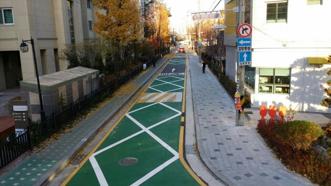 또한 전체적으로 도로를 색채 이미지와 디자인 패턴이 적용된 도막형 바닥재로 포장, 시각적인 인지를 통해 자동차들이 서행할 수 있도록 유도하고 도로 전반 분위기를 차량보다 보행자가 우선인 도로환경으로 조성했다.