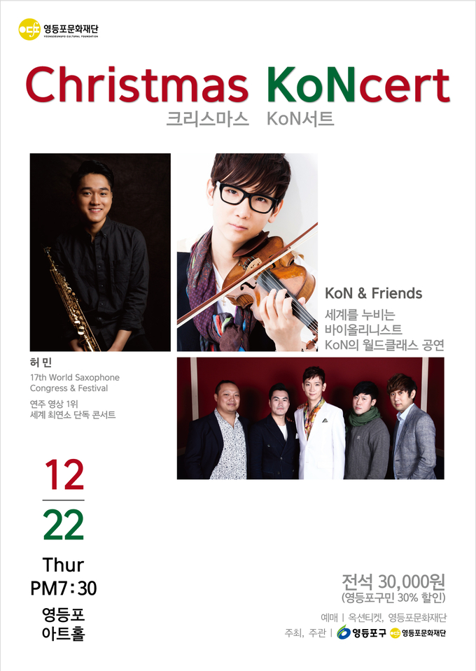 [영등포신문=김정남 기자] 영등포문화재단은 연말을 맞아 한 해 동안 영등포문화재단 사업에 관심을 가져 주신 분들과 영등포 구민에게 감사의 마음을 담아 연말 특별공연 '크리스마스 KoN서트' 를 영등포아트홀 무대에 준비 중이다. 22일 열리는 <크리스마스 KoN서트>는 천재 섹소포니스트 <허 민>과 세계에서 사랑받는 한국 최초의 집시바이올리니스트 <KoN>이 출연하는 공연으로, SBS스타킹 6회 출연에 빛나는 <허 민>의 감미로운 섹소폰 연주와 <KoN> 집시밴드의 라이브 음악을 감상하면서 차분하게 한 해를 돌아볼 수 있는 시간을 선사할 예정이다. 이번 공연의 가격은 전석 30,000원이지만 영등포 구민, 영등포문화재단 도서관 회원증 소지자, 영등포문화재단 교육강좌 수강생, 영등포문화재단 MS카드 소지자는 모두 30% 할인된 가격으로 관람하실 수 있다. 문의: 영등포문화재단 문화사업팀 (02-2629-2216)
