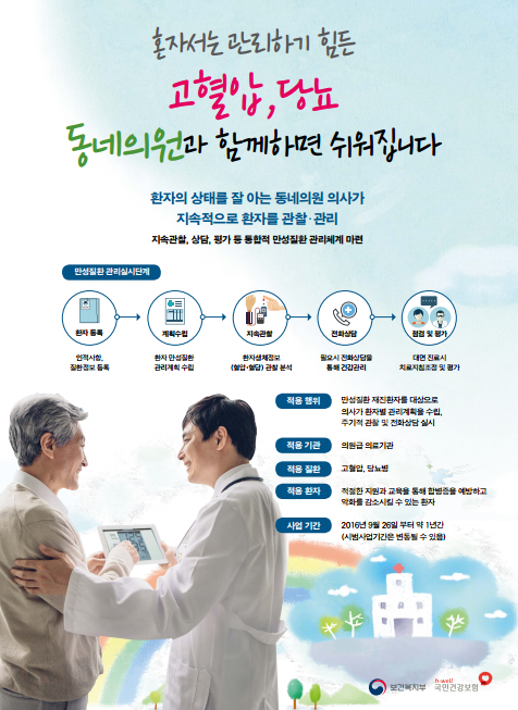 따라서 혼자서 관리하기 힘든 고혈압, 당뇨질환을 동네의원 주치의를 통해 지속적으로 관리 받으실 수 있도록 '만성질환관리 시범 사업'을 시행하고 있다.
