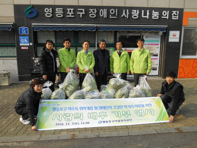 [영등포신문=김경진 기자] 영등포구시설관리공단(이사장 고현순) 제2스포츠센터는 지난 12월 7일 옥상 텃밭을 활용해 재배한 친환경 배추를 영등포구 관내 취약계층에게 지원하는 사랑의 배추 기부 행사를 실시했다고 밝혔다.