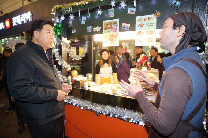 [영등포신문=육재윤 기자] 조길형 구청장(왼쪽)이 21일 개장한 사러가57야시장(신길로 155)에서 러시아 음식부스 운영자로부터 메뉴설명을 듣고 있다.