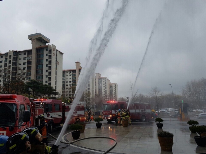 건물의 상층부에 화재가 발생한 것으로 가상해 고층건축물 화재시 대피훈련 및 화재 진압 소방훈련 등이 실시됐다.