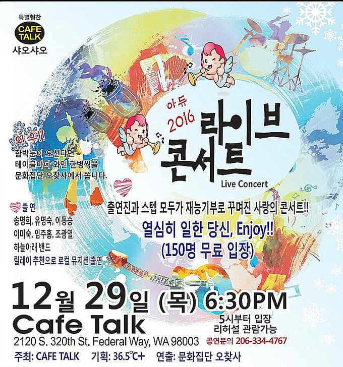 [영등포신문=김정남 기자] 한 해를 보내는 아쉬움을 달래는 '아듀 2016 사랑의 콘서트'가 오는 29일 페더럴웨이 카페톡에서 열린다.