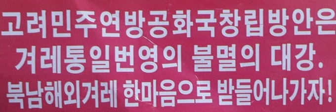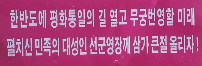 붉은색 아트지에 양면으로 인쇄된 이 삐라에는 “한반도에 평화통일의 길 열고 무궁번영할 미래 펼치신 민족의 대성인 선군영장(김정은 지칭)께 삼가 큰절 올리자!”, “고려민주연방공화국 창립방안은 겨레통일 번영의 불멸의 대강. 북남해외겨레 한마음으로 받들어나가자!”라고 적혀 있었다.
