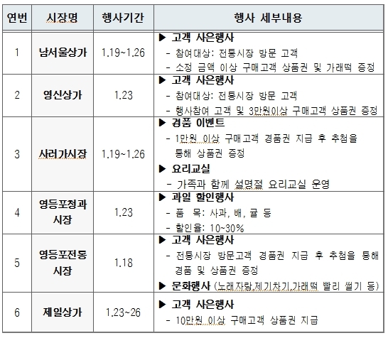 가장 먼저 행사를 진행하는 영등포전통시장(1.18)을 비롯해 사러가시장(1.19~1.26), 남서울상가(1.19~), 제일상가(1.23~1.26), 영등포청과시장(1.23), 영신상가(1.23)에서는 일정금액 이상 구매 고객을 대상으로 전통시장 온누리 상품권을 증정한다.