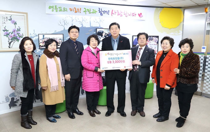 [영등포신문=육재윤 기자] 한독화장품주식회사(대표이사 사장 나애숙)는 17일 영등포구 관내의 소외된 이웃과 함께 희망을 나누기 위한 ‘희망온돌 따뜻한 겨울나기’ 후원행사로 생활용품 및 건강식품 총 460셋트, 총 3천만원 상당의 성품을 영등포구에 기탁하였으며, 밥상공동체·연탄은행에 연탄 2,500장을 기부했다.