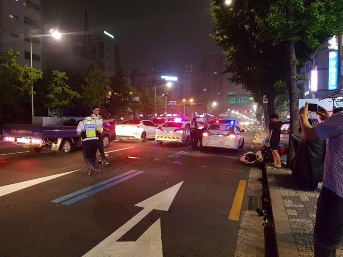 [영등포신문=최재임 주부기자] 11일 오후 11시55분 경 영등포유통상가 앞 진단방사선과 사거리에서 달리던 오토바이가 무단횡단하는 행인을 피하려다 가로수를 들이 받고 넘어졌다.