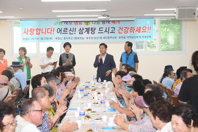 행사에 참석한 어르신 한분 한분의 안부와 인사를 나누며, “정성이 가득 담긴 삼계탕이 어르신 여러분의 기력 보충에 도움이 되길 바란다. 자녀분이 만들어 준 식사를 대접받는다는 생각으로 기분 좋게 드시고 항상 즐거운 마음으로 120세까지 장수하시길 바란다”고 했다.