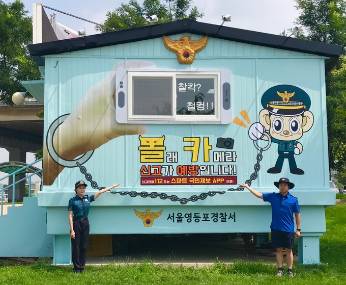 [영등포신문=신예은 기자] 서울 영등포경찰서(서장 조병노)는 24일 영등포구 여의도 한강공원에 위치한 여의도 여름파출소(6.30~8.31) 외벽에 몰카 등 성범죄 범죄 예방을 위한 이색조형물을 설치하고 여의도 한강수영장 등 이용객이 많은 시설에 몰카 범죄예방 대형 홍보 포스터를 부착했다.