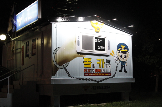 여름파출소 외벽은 ‘몰래카메라 신고가 예방입니다’라는 문구와 함께 몰카범을 포돌이가 검거하는 모습을 형상화하여 몰카범은 반드시 경찰에 검거된다는 메시지를 담았다.