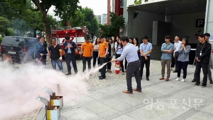 이날 가상화재소방훈련은 가상시나리오에 따른 화재발생 및 대피훈련 지도, 신속한 현장출동을 위해 출동로 확보 현지적응훈련, 소방대상물 건물구조 및 특수용도 등 건물정보 파악, 자위소방대 소화기 및 옥내소화전 사용법 교육의 순으로 진행됐다.