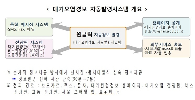 기존에는 경보상황이 발생하면 시가 언론을 통해 즉각 알리고 대기환경 홈페이지에 정보를 등록, 시민과 공공기관에 문자 및 팩스 전송, 모바일 서울, SNS, 전광판 게시 등까지 순차적으로 전파했다. 평균적으로 약 30분 정도의 시간이 소요됐다.